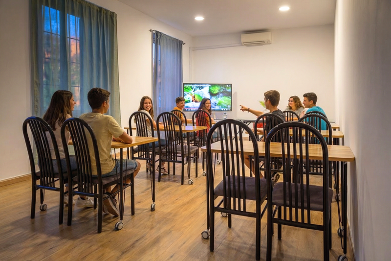 Grazie alla disposizione modulare dei banchi con rotelle, lo spazio si adatta con facilità a ogni esigenza, garantendo massima flessibilità e comfort.