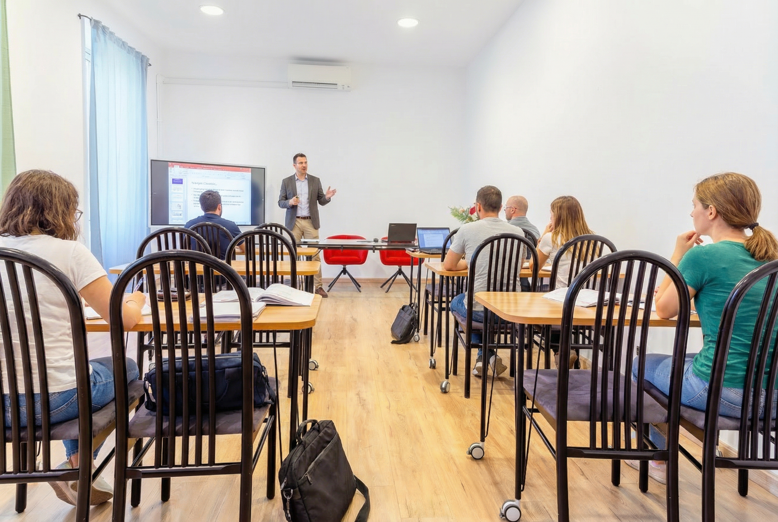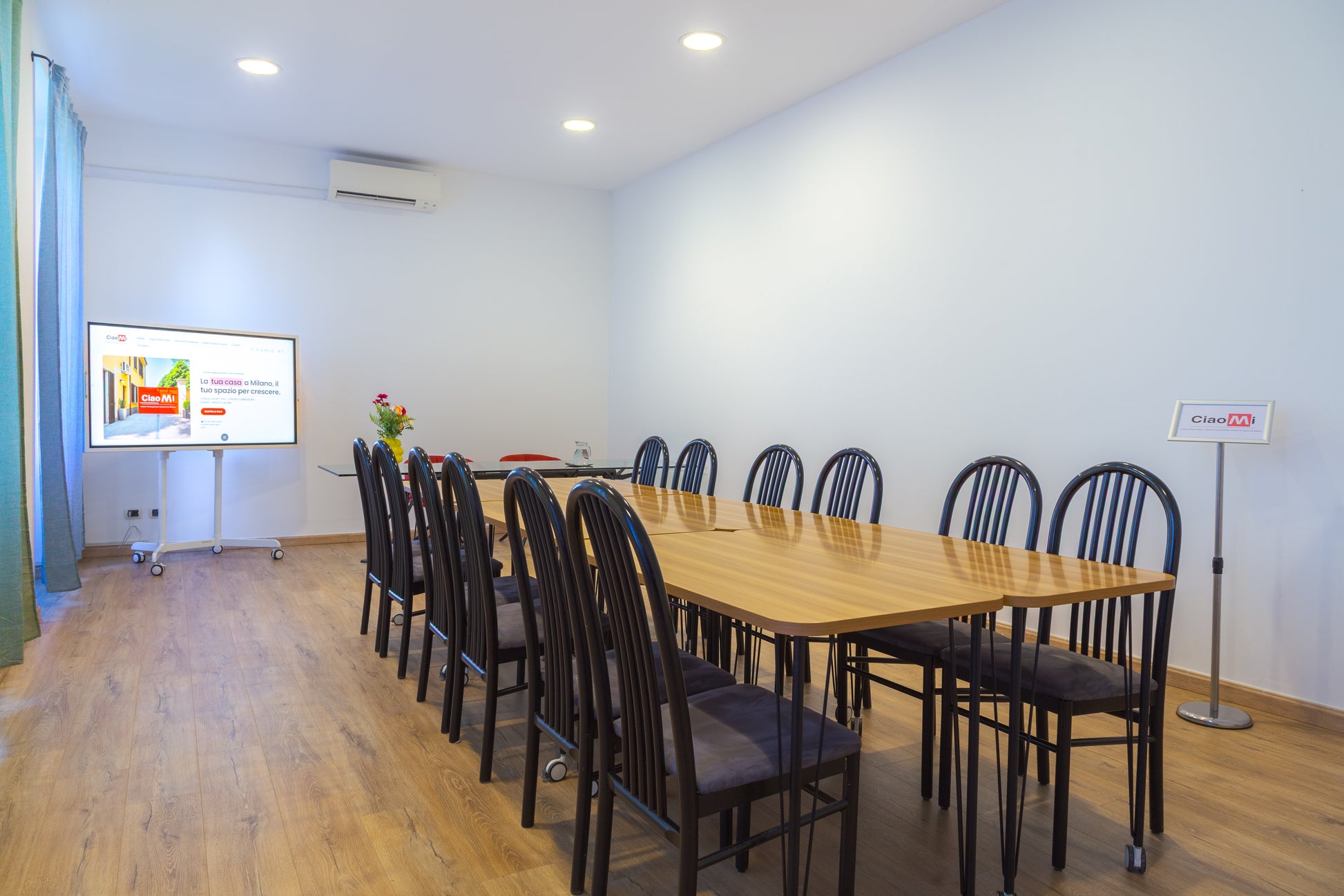 Tavoli con rotelle, lavagna digitale,, proiettore, climatizzatore, sedie, Wi-Fi